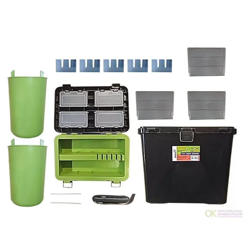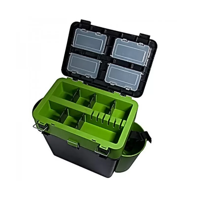 Пластик не подвержен деформациям и прекрасно удерживает первоначальную форму ящика даже при значительном весе рыбака. Ящик из такого пластика не впитывает запахи и легко отмоется от рыбной слизи, глины и других загрязнений. Функциональное основное отделение служит своеобразным каркасом, предотвращающим прогибы ящика и надежно удерживающим вес рыбака. Съемные перегородки предназначены для более удобного хранения принадлежностей.