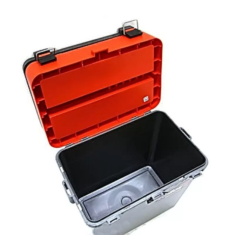 Основной отсек предназначен для переноски рыболовных снастей, термоса, так же удобен для перевозки улова. На внутренней стороне крышки размещены 4 отделения с полупрозразчными крышечками для хранения мелких аксессуаров.